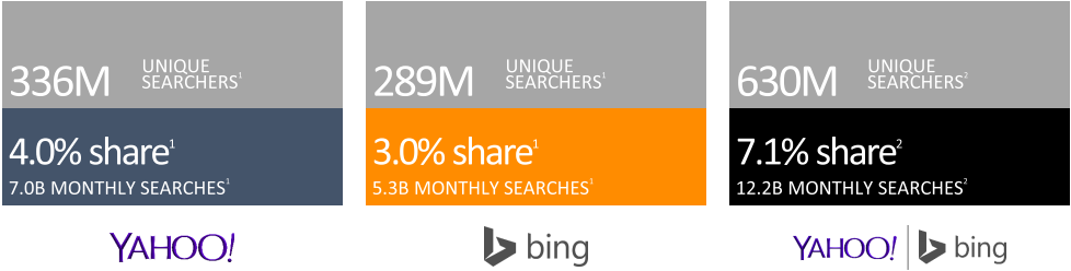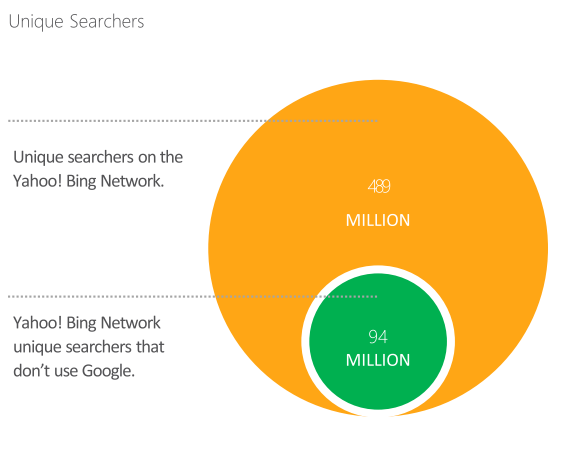 2)必應(yīng)+雅虎的用戶中有19.3% (9400萬)的搜索用戶不使用Google,這些用戶只能通過必應(yīng)+雅虎才能觸達(dá)。在美國,微軟和雅虎月搜索請求達(dá)60億次,占市場近1/3。月覆蓋用戶達(dá)到近1.6億,達(dá)90%。 其中, 4730萬用戶只使用必應(yīng)和雅虎搜索,而不使用Google。