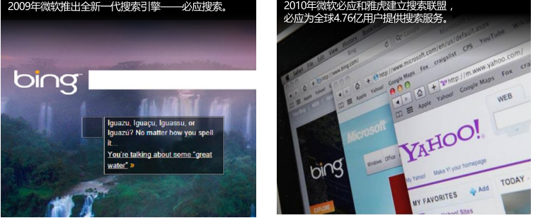 1)2010年與雅虎合作,結(jié)成搜索聯(lián)盟,除日本之外所有國家yahoo搜索結(jié)果都展示bing的廣告